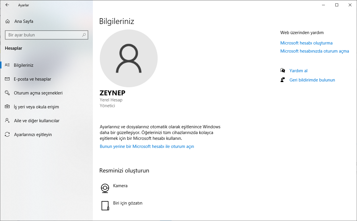 Windows da, Başlangıç > Ayarlar > Hesaplar tıklayınız.