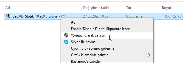 Açılan menüden ”Yönetici olarak çalıştır” satırını tıklayarak kurulumu çalıştırınız.
