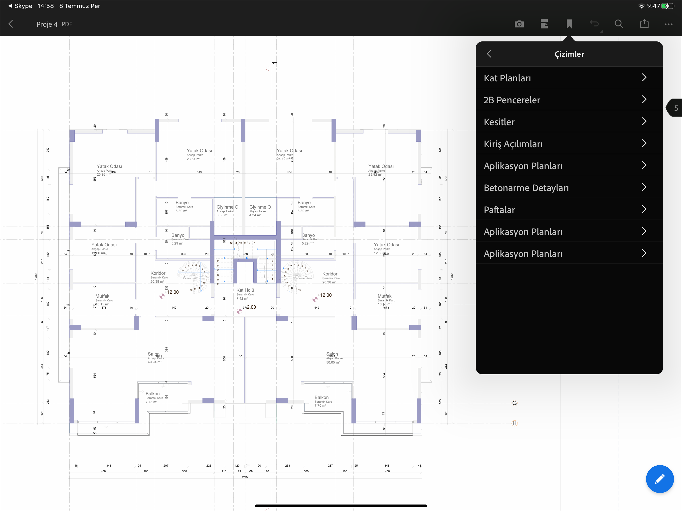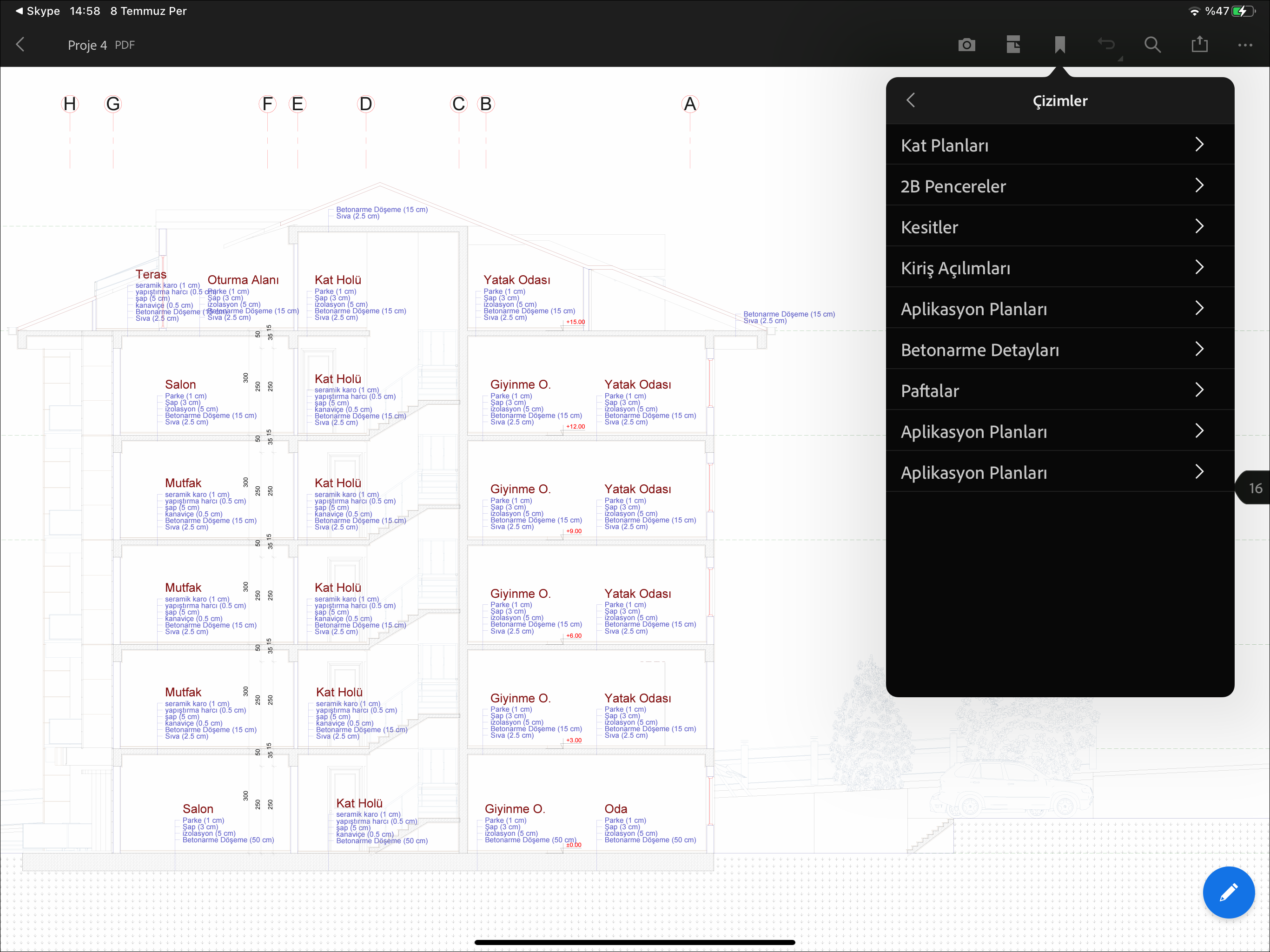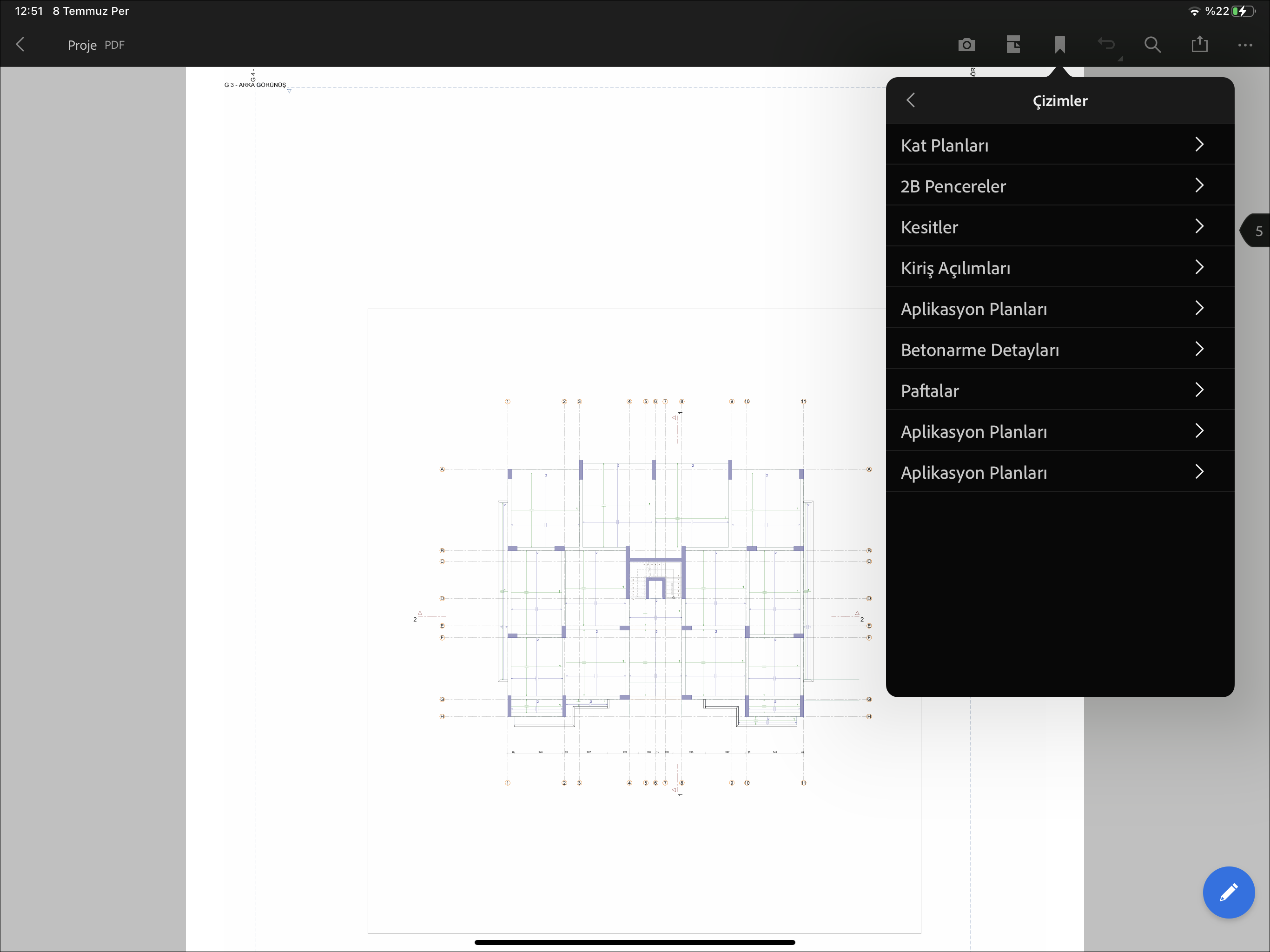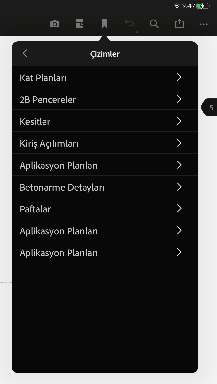Yer imleri işaretine dokunarak pdf dosyasında yer alan çizimlerin listesine ulaşabilir, bu listeden istediğiniz çiziminize geçiş yapabilirsiniz.