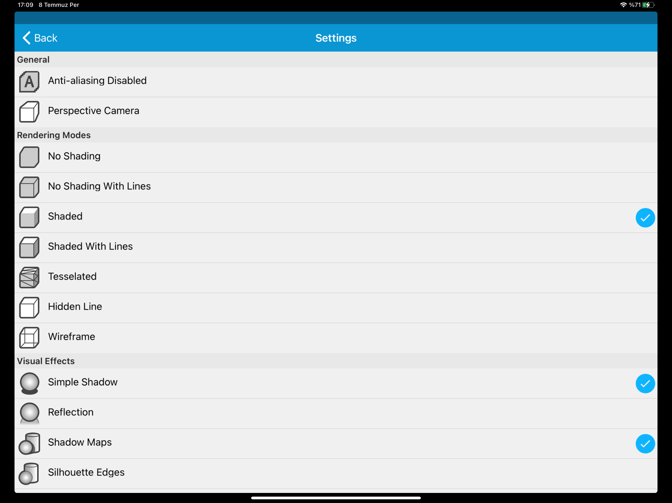 Sağ üst köşede ayarlar ikonuna girerek modelinizde farklı görüntüleme teknikleri kullanabilirsiniz.