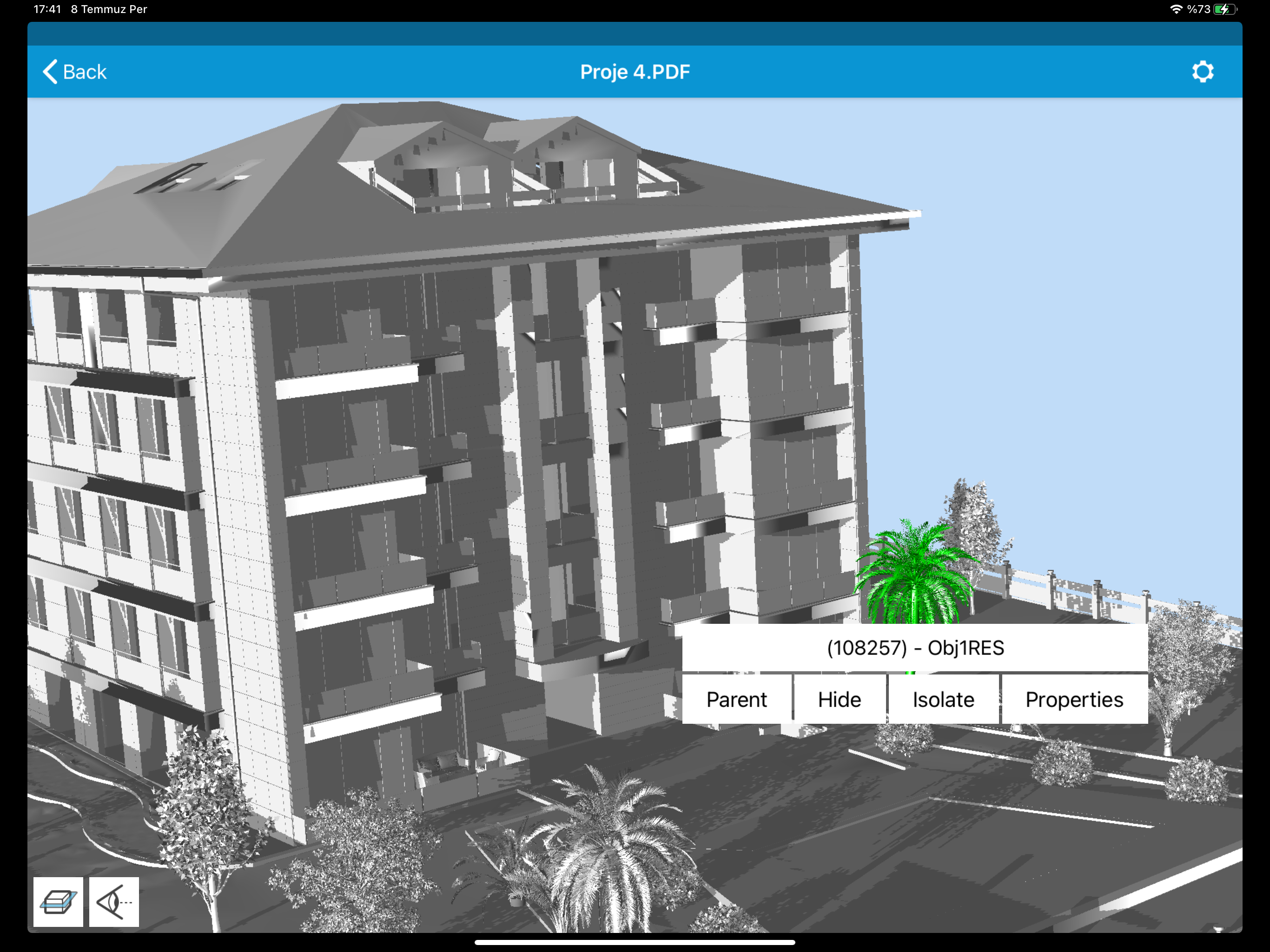 Parent butonu ile seçtiğiniz objenin ait olduğu kattaki tüm objeleri tek seferde seçebilir, isolate ya da hide butonlarını kullanabilirsiniz.