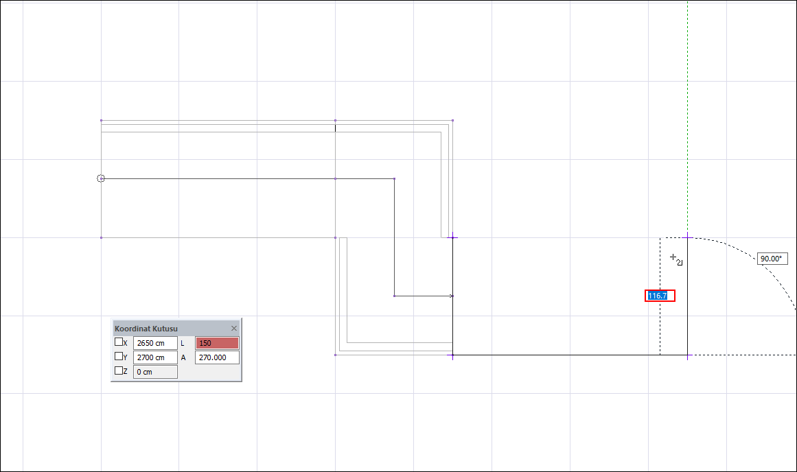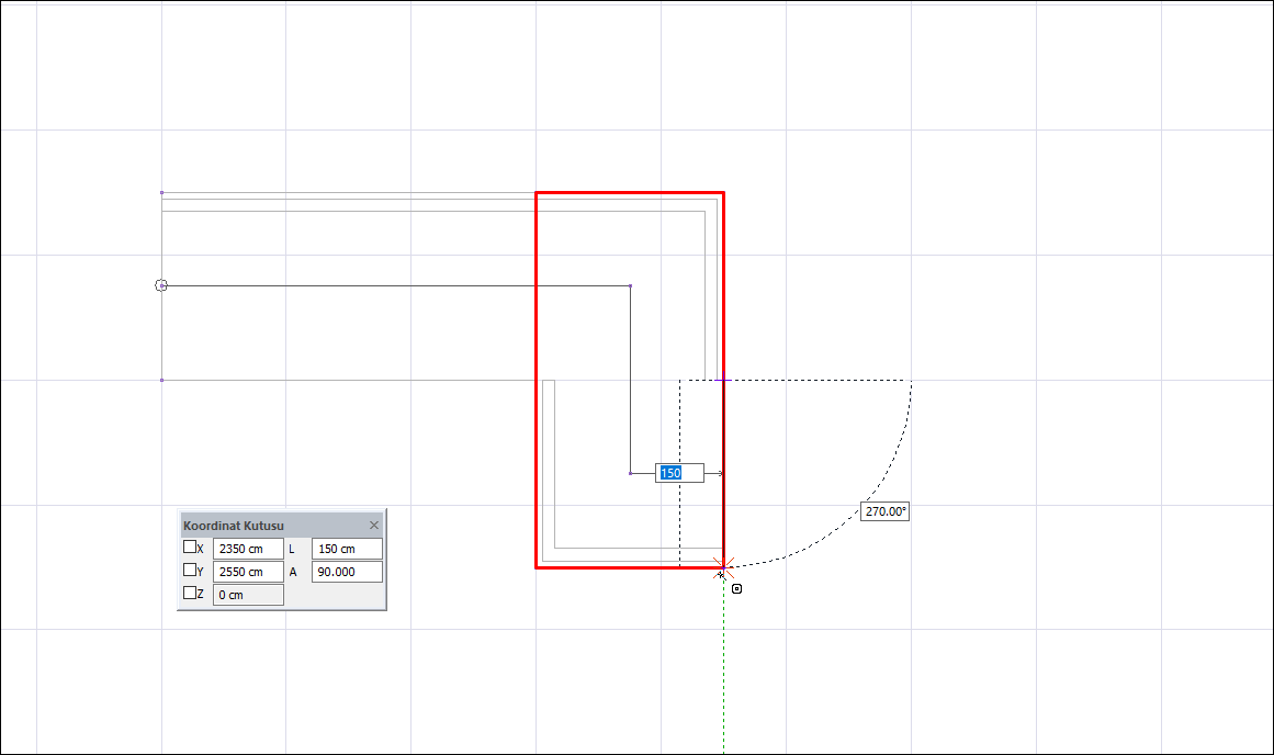 Rampa alanının enini girmek için klavyeden L tuşuna basın. Uzunluk değeri olarak 150 (cm) girin ve Enter tuşuna basın.