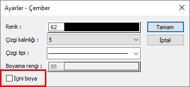 Çember ve elips ilkel objelerinin ayarlar diyaloğundan içini boya özelliğine ulaşabilirsiniz.