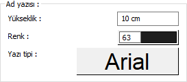Ad yazısı ![]() Çapraz adı yazısının yüksekliği girilir. Renk kutusu farenin sol tuşu ile tıklanıp tuş basılı tutularak açılan renk paleti üzerinde kaydırılır. İstenen rengin üzerine gelindiğinde tuş bırakılır. Renk kutucuğu seçilen renge dönüşür. Shift tuşu ile birlikte tıklanırsa, ilgili rengin kalem kalınlığı ayarlanabilir. Hemen alttaki buton tıklanırsa, Yazı Tipi Ayarları diyalogu açılır. Bu diyalogdan çapraz ad yazısı, yazı tipi ayarlanır. |