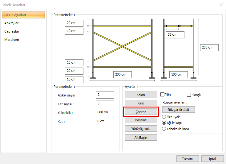 İskele çapraz ayarları, iskele ayarları diyaloğu iskele ayarları sekmesinden yapılır.