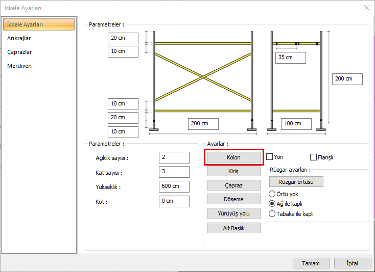 İskele kolon ayarları, iskele ayarları diyaloğu iskele ayarları sekmesinden yapılır.