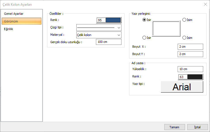 Eğrilik yarıçapı ![]() Kolonun yüksekliğini baz alan yay parçasının merkezine göre yarıçap değeri verilir. Negatif değer diğer tarafa eğrisellik oluşturacaktır. |