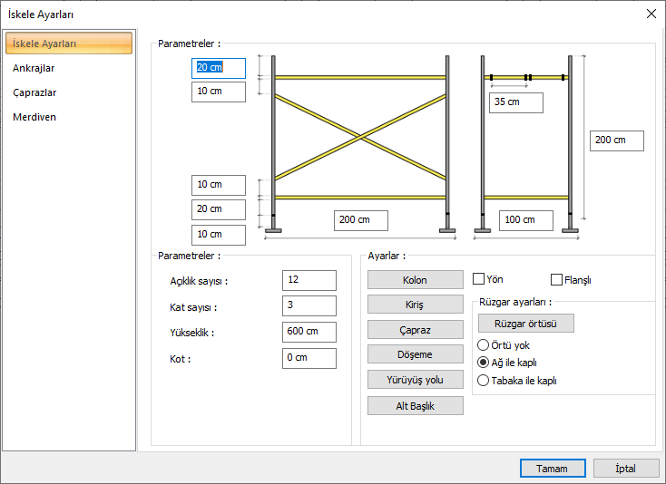 Ayarlar diyaloğunda iskelenin eleman kesitleri, ankraj noktaları, çapraz konumları gibi özelliklerini ayarlayın ve tamam butonunu tıklayın.