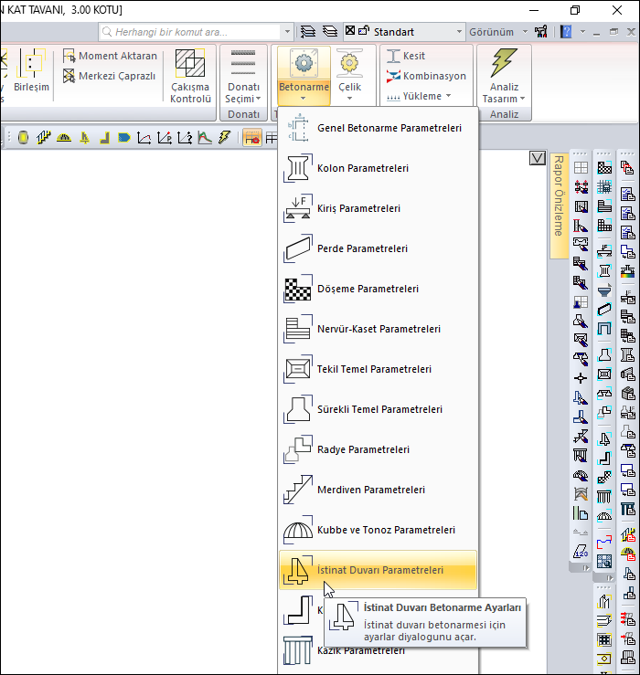 Ribbon menü Analiz ve Tasarım sekmesi Tasarım Parametreleri başlığı altından İstinat Duvarı Parametreleri komutuna tıklayarak İstinat Duvarı Parametreleri diyaloğuna ulaşabilirsiniz.