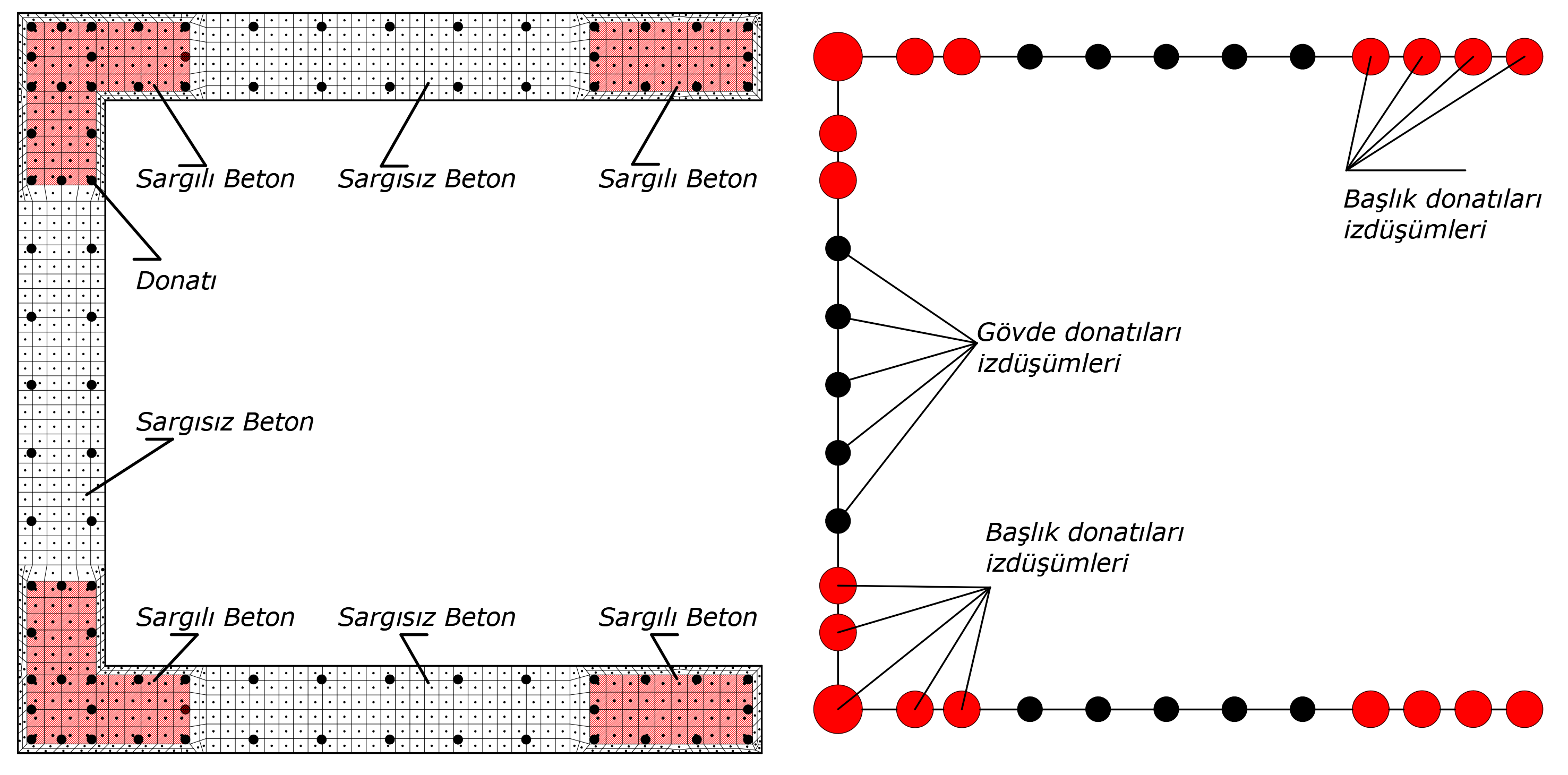 Aşağıdaki resimde bir U poligon perdesinin sonlu eleman ve donatı modellerinin temsili gösterilmiştir. Bu resimde koyu renkli çubuklar donatı elemanlarını, beyaz renkli kareler doğrusal olmayan sargısız beton sonlu elemanlarını, taralı şekilde gösterilen kareler doğrusal olmayan sargılı beton sonlu elemanlarını göstermektedir ve perdenin başlık bölgelerinde tanımlanmaktadır.
