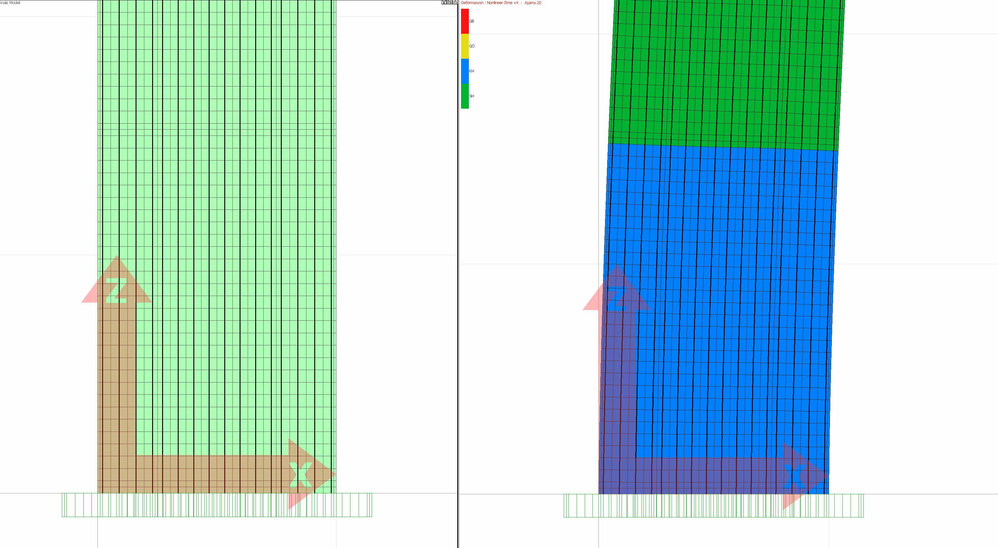 Aşağıda gösterilen poligon perde analiz modelinde, koyu renkli siyah çizgiler donatıları, yeşil renkte gösterilenler iki boyutlu doğrusal olmayan beton sonlu elemanları göstermektedir.