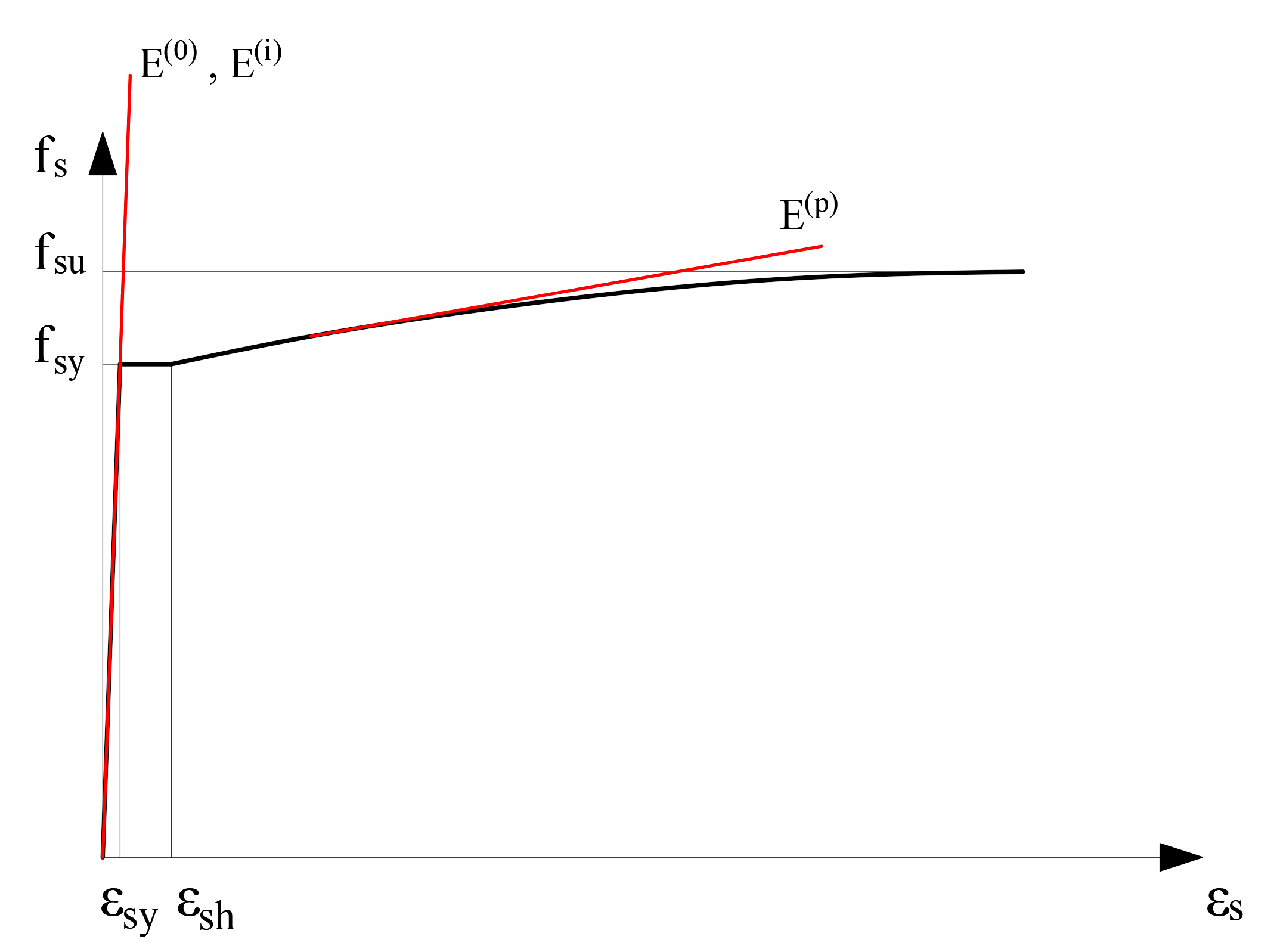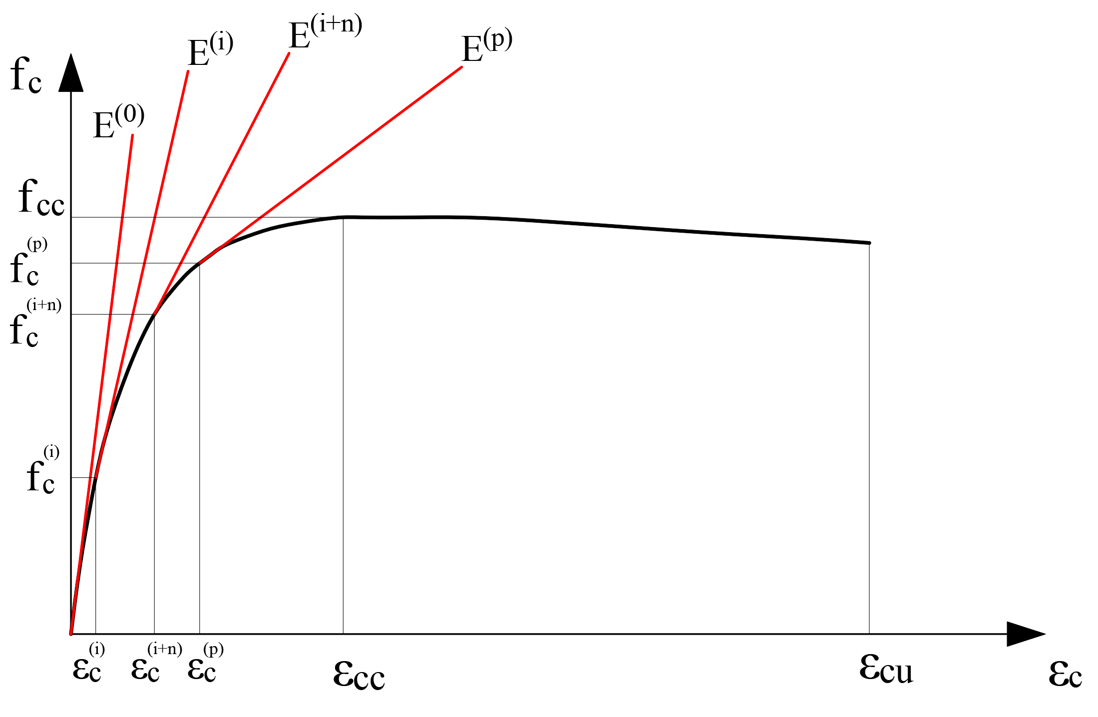 Beton malzeme modelini oluşturan gerilme-birim şekildeğiştirme eğrisi her birim şekildeğiştirme değerine karşılık bir gerilme ve bu noktadaki teğetin eğimi olan elastisite modülünden oluşmaktadır. İtme analizinde başlangıç adımındaki eğimi E(0) olarak, i 'nci adımdaki elastisite modülü E(i) ve son adımdaki elastisite modülü E(p) olarak gösterilmiştir. Başlangıç elastisite modülü beton sınıfına göre değişiklik göstermektedir. Herhangi bir i 'nci adımdaki herhangi bir doğrusal olmayan iki boyutlu beton sonlu elemanının eksenel rijitliği olan F11 değeri, E(i)/E(0) değeri ile azaltılarak perde rijitliği tekrar oluşturulur. Aşağıdaki resimde sargılı beton malzemesinin her bir adımdaki gerilme-birim şekildeğiştirme ve elastisite modülü değişimi gösterilmiştir.