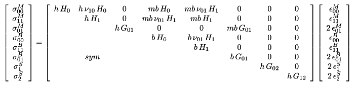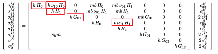 Ortotropik malzeme ile tanımlanmış bir iki boyutlu bir sonlu elemanın gerilme-birim şekildeğiştirme matrisi aşağıdaki gibi tanımlanmaktadır. Bu matriste σ00M ve σ11M terimleri düzlem içi eksenel gerilmeleri, σ01M terimi düzlem içi kayma gerilmelerini, σ00B ve σ11B terimleri düzlem dışı eğilme sonucu oluşan gerilmeleri, σ01B düzlem içi eğilme sonucu oluşan gerilmeleri, σ1S ve σ2S terimleri düzlem dışı kayma gerilmelerini ifade etmektedir.