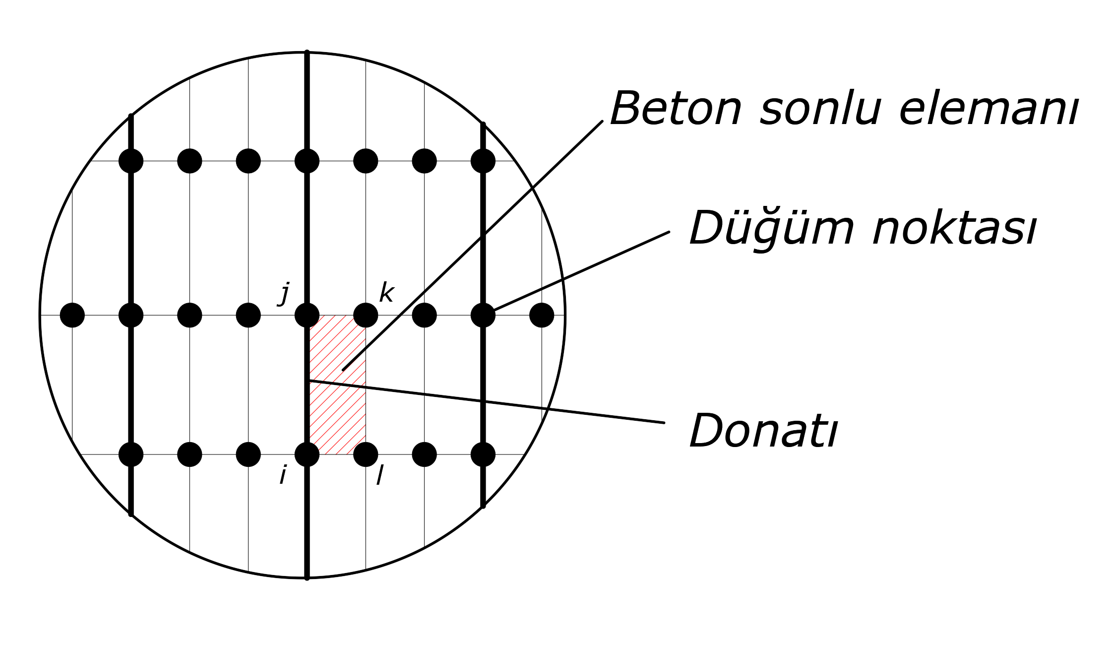 Aşağıdaki resimde doğrusal olmayan iki boyutlu beton sonlu elemanlarından bir tanesi kırmızı renk ile taranmış, donatı modeli de koyu renk ile gösterilmiştir. Bir adet dikdörtgen beton sonlu elemanın düğüm noktaları (i,j,k,l) olmak üzere, donatı malzemesi bu resimde i ve j düğüm noktaları arasında tanımlanmıştır. Donatı birim şekildeğiştirmeleri hesaplanırken i ve j düğüm noktaları arasındaki uzama değeri, i,j düğüm noktalarının ilk konumları arasındaki uzaklığa bölünerek elde edilir.