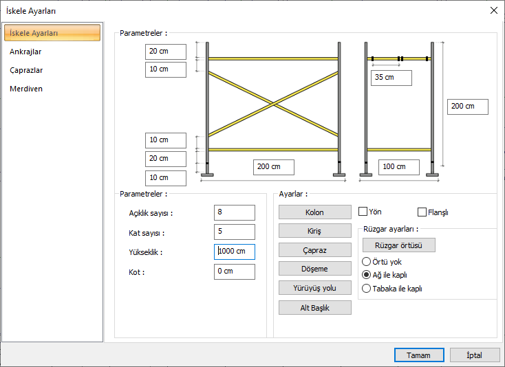Ayarlar diyaloğunda iskelenin eleman kesitleri, ankraj noktaları, çapraz konumları gibi özelliklerini ayarlayın ve tamam butonunu tıklayın.