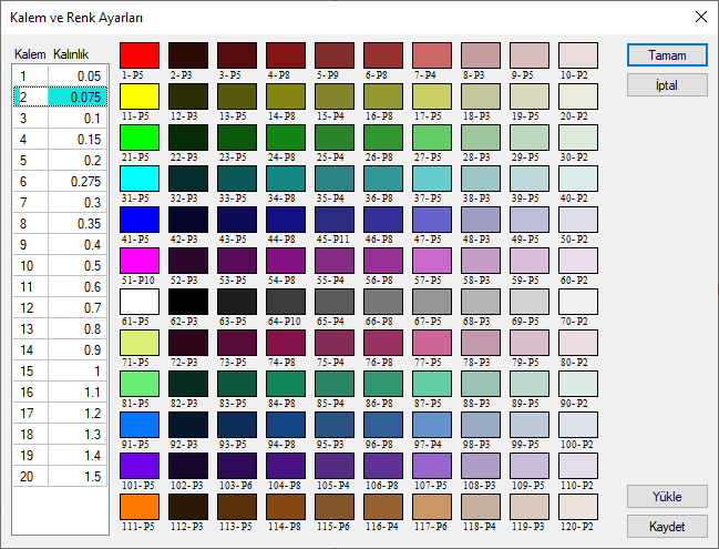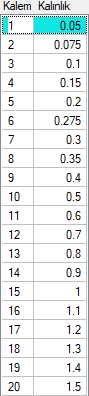 Kalem ve Kalınlık ![]() Kalem numaraları ve bu kalemlere karşılık gelen kalem kalınlıkları listelenir. Kalınlık sütunundaki değerler milimetre cinsindendir ve değiştirilebilir. |