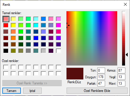 Açılan renk diyaloğunda istediğiniz rengi belirleyin ve Tamam butonunu tıklayarak diyaloğu kapatın.