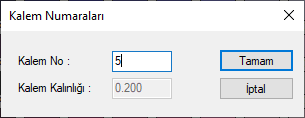 Kalem kalınlıkları diyaloğunda girilecek kalem numarası 1-20 arasında bir değer olmak zorundadır. Bu aralığın dışında bir değer girilirse dikkate alınmaz ve mevcut kalem numarası korunur.