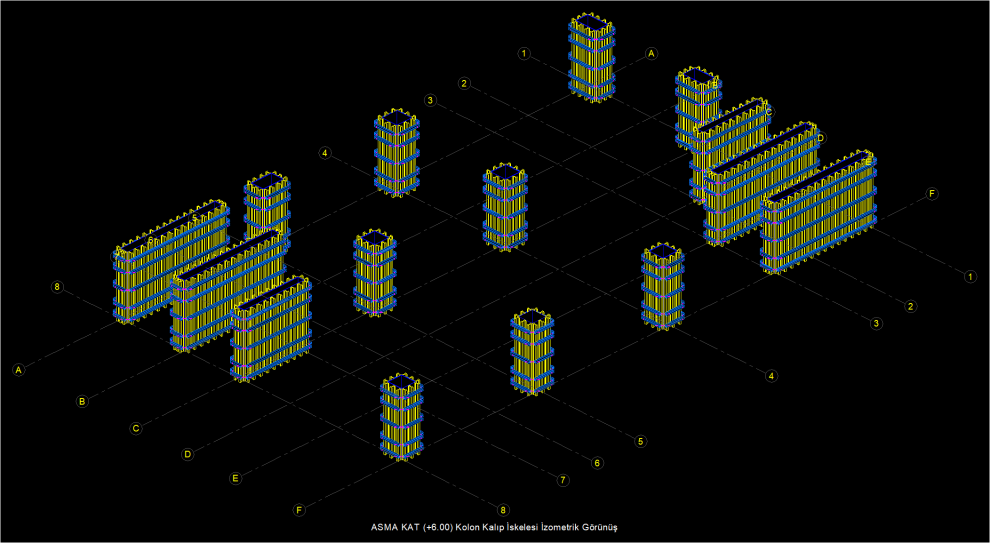 3B İzometrik Görünüş Çizimleri komutu ile aktif katın kalıp iskelesinin kolon/perde, kiriş ve döşemelerinin 3B izometrik çizimleri oluşturulur.
