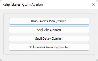 Kalıp İskelesi Çizimleri komutu ile Kalıp İskelesi Çizim Ayarları diyaloğu açılır. Kalıp iskelesi plan çizimleri, seçili aks çizimleri, seçili detay çizimleri ve 3B izometrik görünüş çizimlerinden biri seçilerek kalıp iskelesi çizimleri oluşturulur.