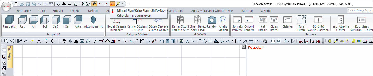 Klavyeden Shift+Tab tuşuna basarak ya da hızlı erişim toolbarından Mimari Plan-Kalıp Planı ikonunu tıklayarak yapabilirsiniz.