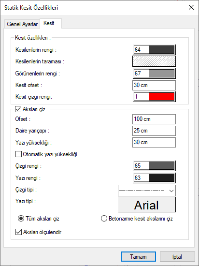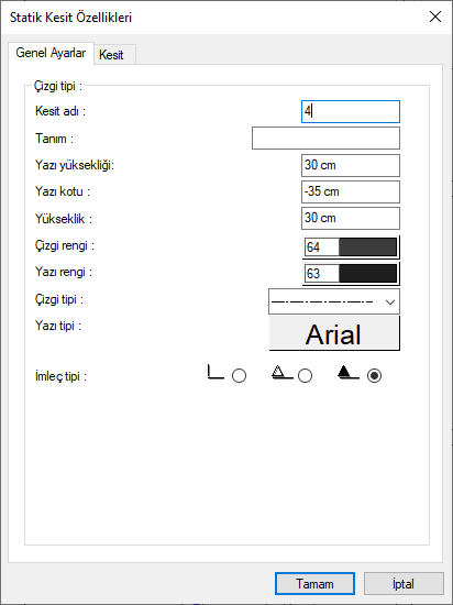 Yazı tipi ![]() Kesitte gösterilen aks yazılarının yazı tipidir. Yazı tipi kutucuğu tıklandığında açılan yazı tipi listesinden uygun yazı tipini seçin. |