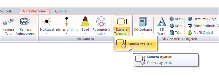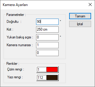 Kamera Ayarları komutuyla doğrultu, kot, bakış açısı, renk seçimi gibi ayarlara ulaşılır.