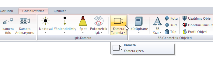 Ribbon menü Görselleştirme sekmesi Işık - Kamera başlığı altından ulaşabilirsiniz.
