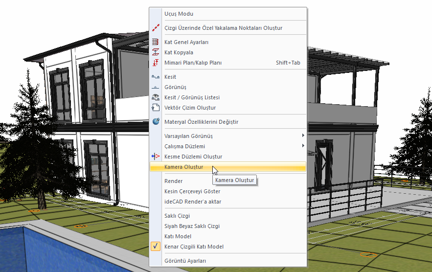 Perspektif pencerede farenin sağ tuşuna tıklayarak açılan menüden Kamera oluştur komutuna ulaşabilirsiniz.
