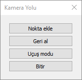 Bitir ![]() Nokta eklemeleri tamamlandıktan sonra bitir butonuna basılarak kamera yolu tanımlanır. |