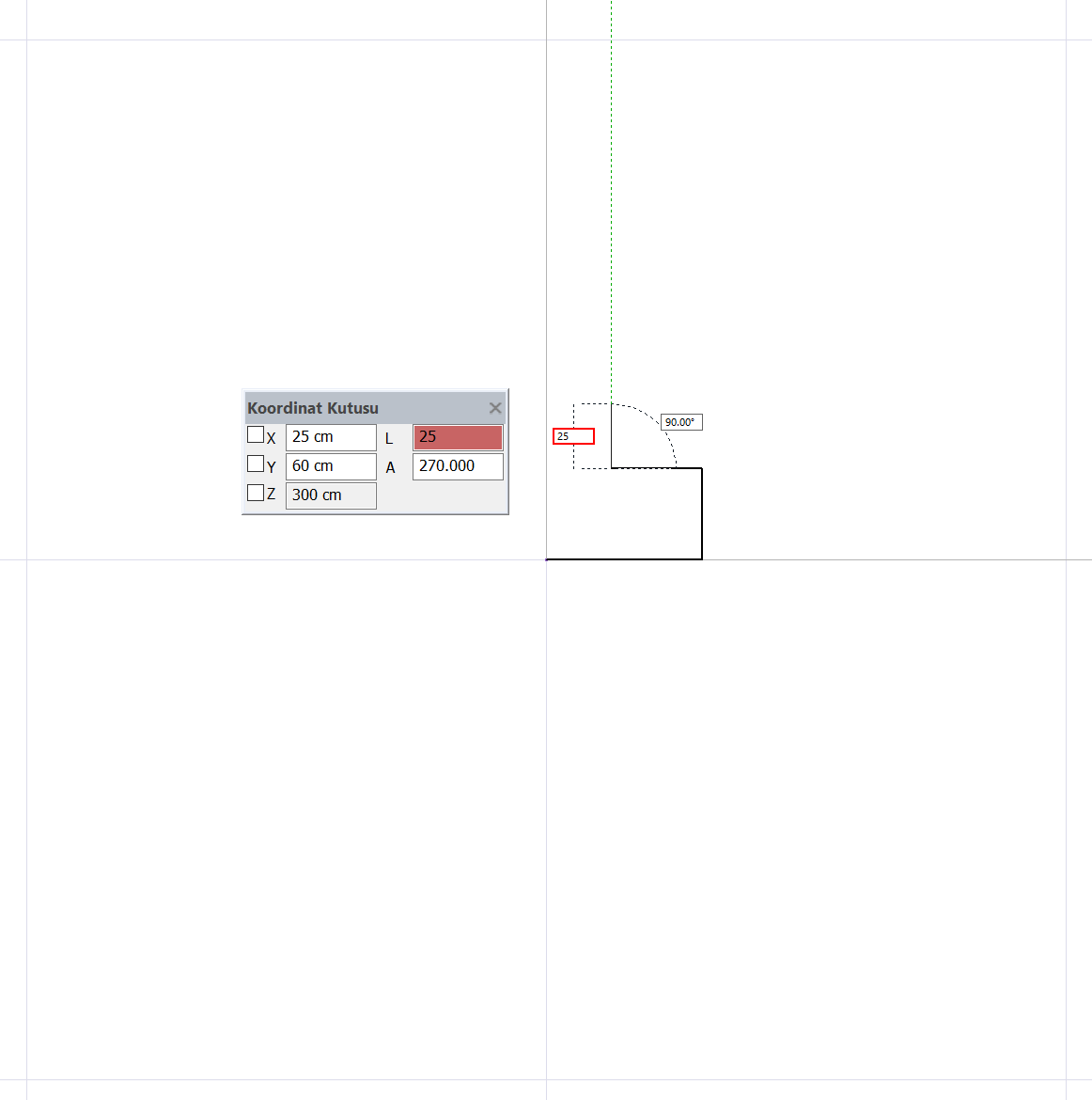 L tuşuna basın ve 25 yazıp enter tuşuna basın. Shift tuşunu basılı tutun ve imleci sola doğru kaydırın. Sol tuşu tıklayın. İlk başladığınız noktaya imleci götürün ve imleç şekli değiştirince sol tuş ile tıklayın. Komuttan çıkmak için klavyeden Esc tuşuna basın.