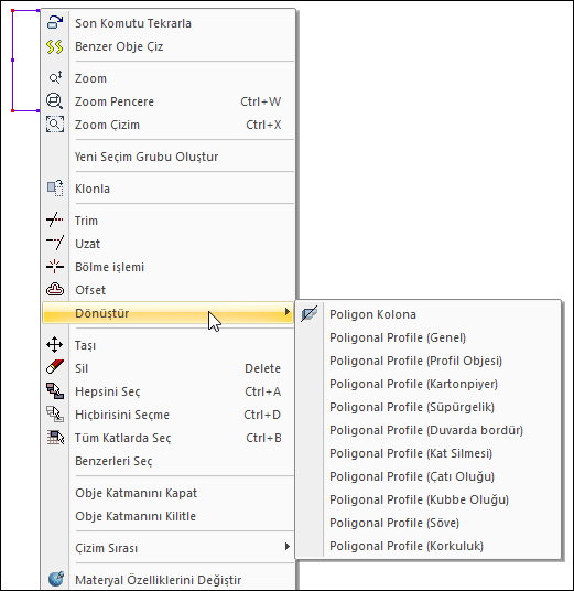 Dönüştür/Poligonal Profile komutuna sağ tuş menüden ulaşabilirsiniz. Dönüştür/Poligonal Profile komutunun; poligonal profile (genel), poligonal profile (profil objesi), poligonal profile (kartonpiyer), poligonal profile (süpürgelik), poligonal profile (duvarda bordür), poligonal profile (kat silmesi), poligonal profile (çatı oluğu), poligonal profile (kubbe oluğu), poligonal profile (söve) ve poligonal profile (korkuluk) seçenekleri yer alır.