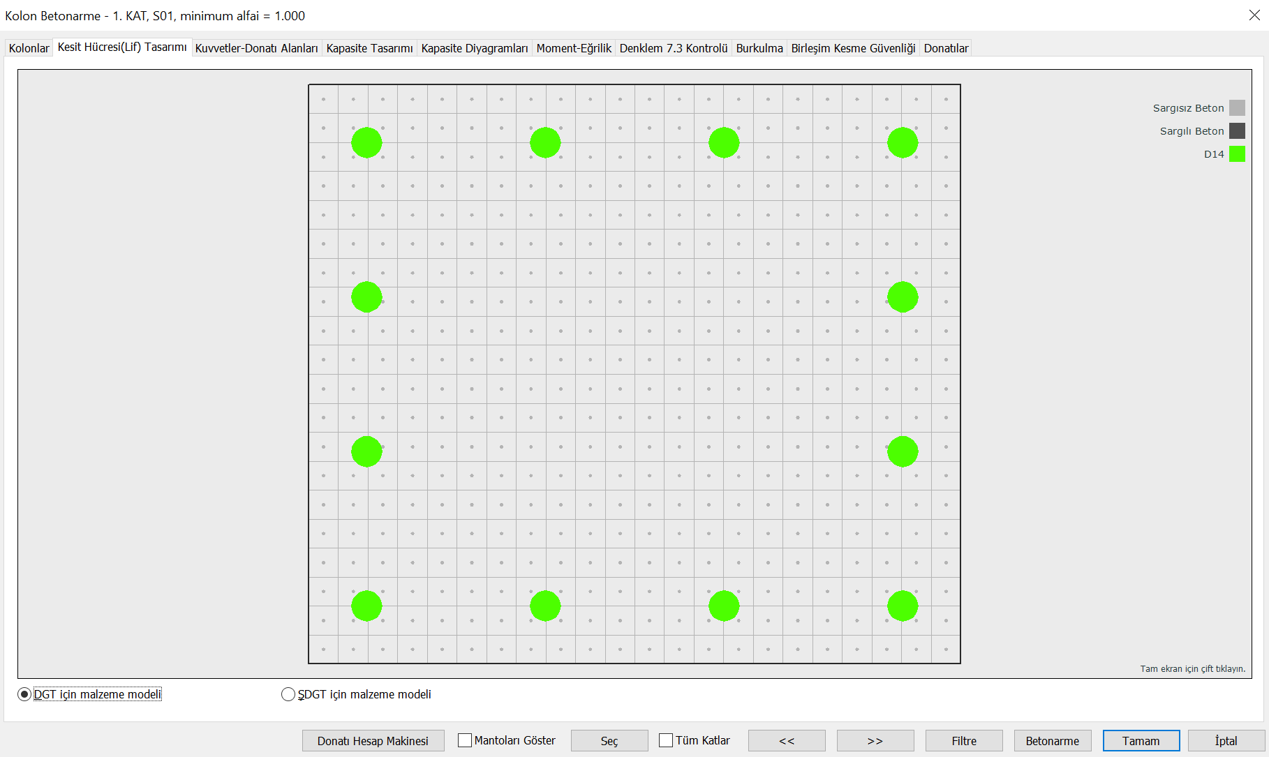 Genel Betonarme Ayarları penceresinde "Fiber beton modelini kullanarak kapasite oranı kontrolü yap" seçeneği aktif hale getirilirse, eksenel kuvvet ve iki eksenli eğilme etkisi altındaki elemanın mevcut donatı yerleşimi ile tüm kombinasyonlar dikkate alınarak hesaplanan etkileşim eğrisi sayesinde kapasite oranları kontrolü yapılmaktadır.