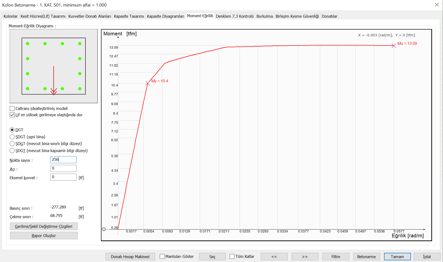 "Fiber beton modelini kullanarak kapasite oranı kontrolü yap" seçeneği aktif halde ise fiber model ile kapasite oranları hesaplanır ve 1 'den büyük olan oranlar yetersizlik olarak verilir. Aşağıdaki resimde bu durum için bir örnek gösterilmiştir.