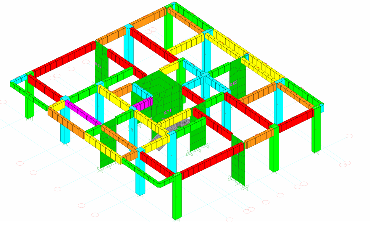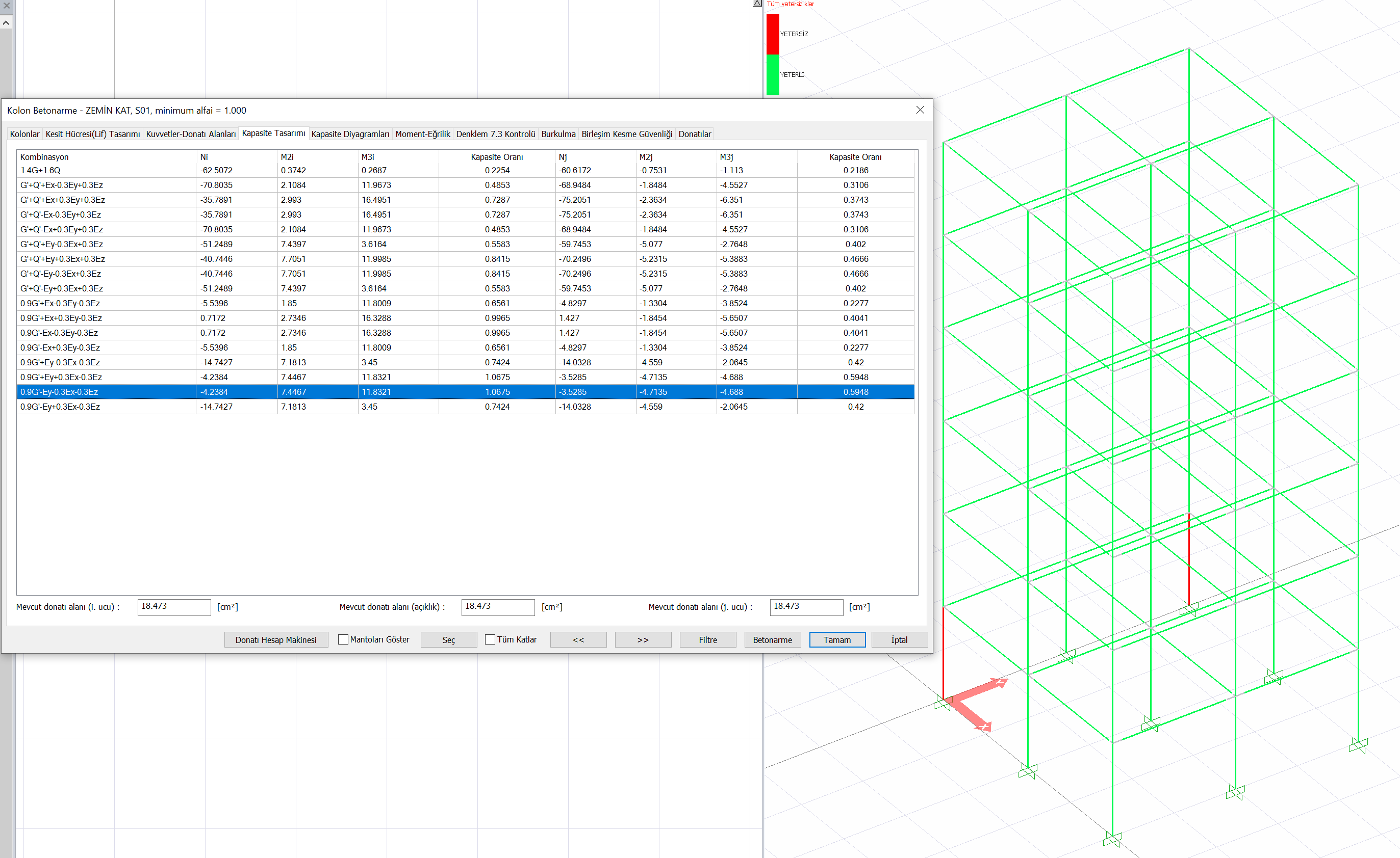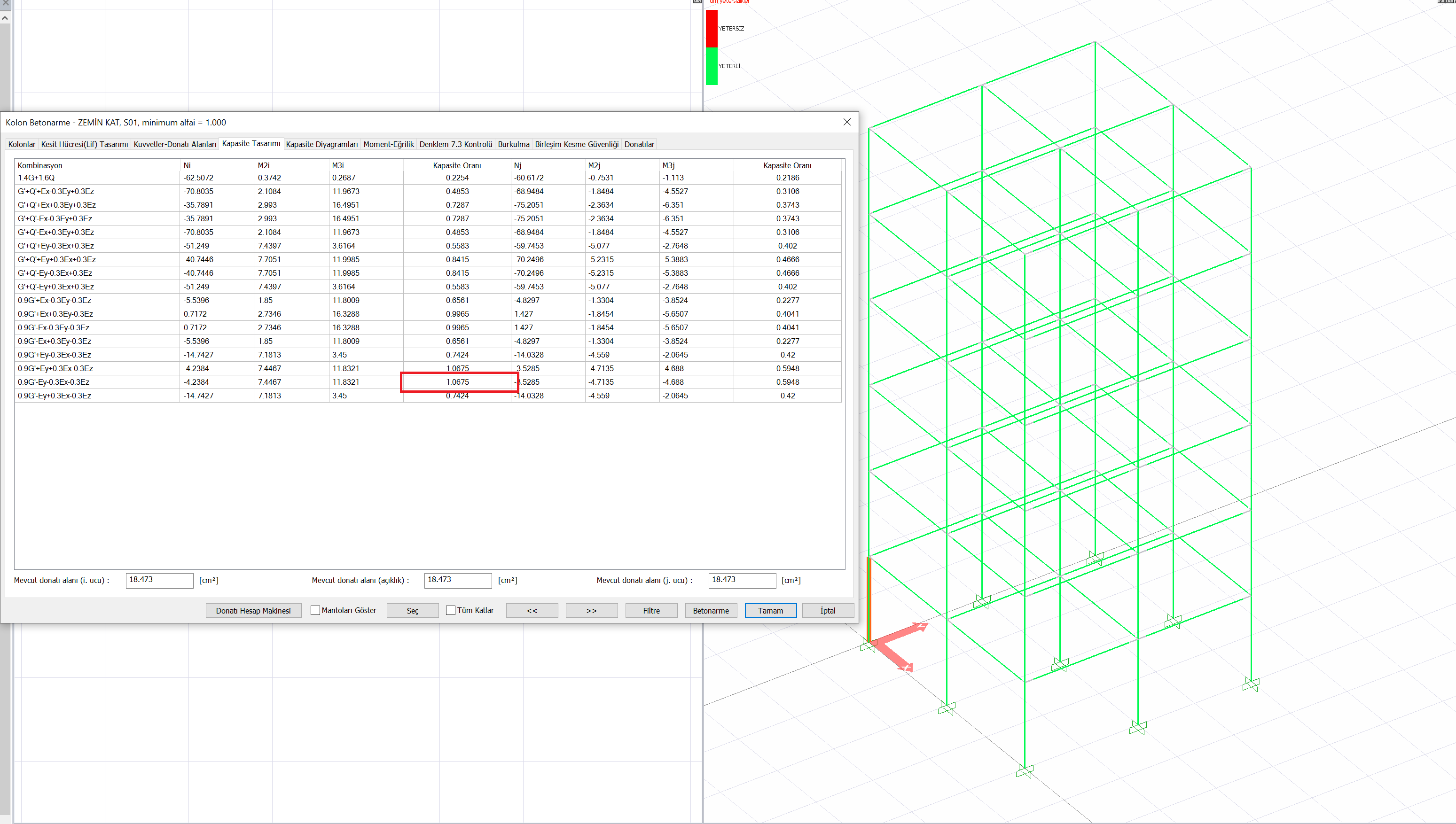 "Fiber beton modelini kullanarak kapasite oranı kontrolü yap" seçeneği aktif hale getirilirse, 3 Boyutlu görselleştirme ekranında kapasite değerleri gösterilmektedir. Kapasite oranının 1 'den büyük olduğu durumlarda ise kırmızı renkle ifade edilmektedir.