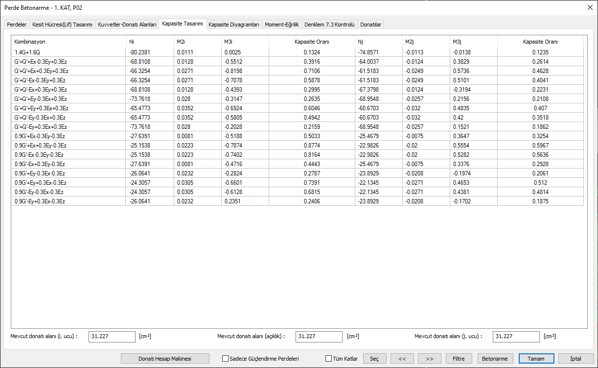 Grup perde Kapasite Tasarımı Oranları, perde betonarmesinde verilmektedir.