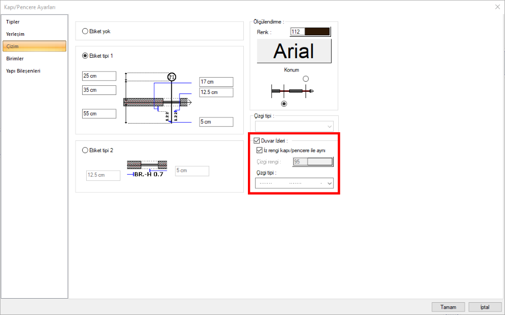 Kapı/pencere ayarları diyaloğu çizim sekmesinden duvar izleri özelliğine ulaşabilirsiniz.