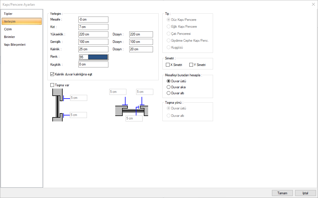 Açılan Kapı/Pencere Ayarları diyaloğunda Yerleşim sekmesine geçin.