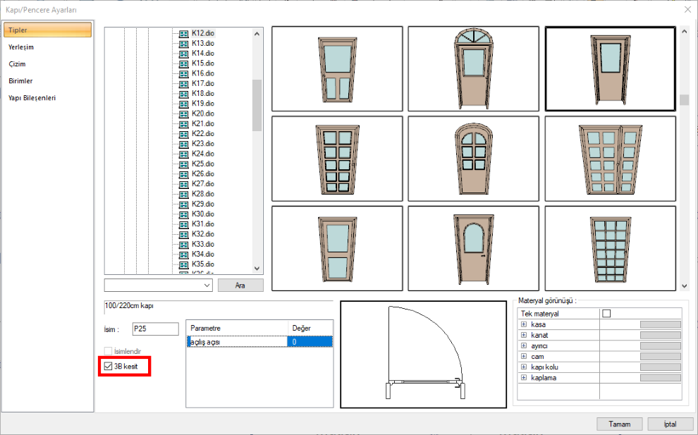 Kapı/pencere ayarları diyaloğu tipler sekmesinden 3B kesit özelliğine ulaşabilirsiniz.
