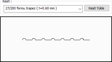 Kesit ![]() Kullanılan profil görünür. Listeyi tıklayarak daha önceden tanımlanmış profillerden biri seçilebilir ya da Kesit Yükle butonu tıklandığında açılan diyalogdan yeni bir profil seçilebilir. |