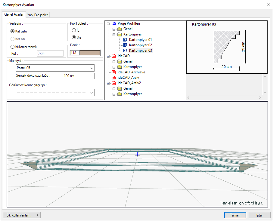 Proje profilleri ![]() Kartonpiyere ait profillerin listesidir. Seçilen profil çevreleme elemanında kullanılacaktır. Profil ön görüntüsü sağ tarafta çizilmektedir. |