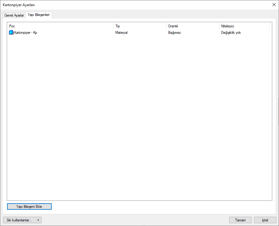 Kartonpiyer Ayarları komutuyla kartonpiyer objesinin yerleşim tipi, kot, materyal ve çizim ayarlarına ulaşılır.