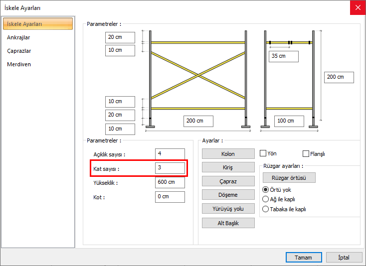 İskele ilk oluşturulurken kat genel ayarlarında tanımlanan kat yüksekliği ve kat sayısı dikkate alınır, iskele yüksekliği otomatik hesaplanır. Açıklık yüksekliğine göre iskele katları oluşturulacaktır. Kat Sayısı ayarı ile sonradan kat eklenir veya mevcut kat silinir.