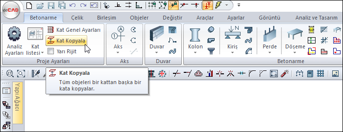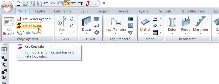 Kat kopyalama komutu bir kattaki objeleri diğer kata ya da katlara kopyalar. Mimari ya da statik proje tasarımında kattaki tüm objeler kopyalanabileceği gibi sadece seçili objeler de kopyalanabilir.