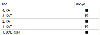 Kat/Kopya ![]() Kopyalama yapılacak katların karşısındaki kutucuklar işaretlenir, kopyalama yapılmayacak katların karşısındaki kutucuklardaki işaretler kaldırılır. |