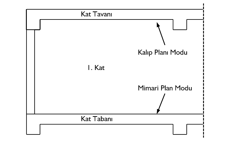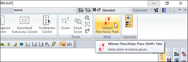 Mimari plan modu ve kalıp planı modu arasında Mimari Plan/Kalıp Planı komutunu kullanarak geçiş yapabilirsiniz.