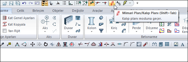 Ayrıca klavyeden Shift+Tab tuşuna basarak ya da hızlı erişim toolbarından Mimari Plan-Kalıp Planı ikonunu tıklayarak da geçiş yapabilirsiniz.