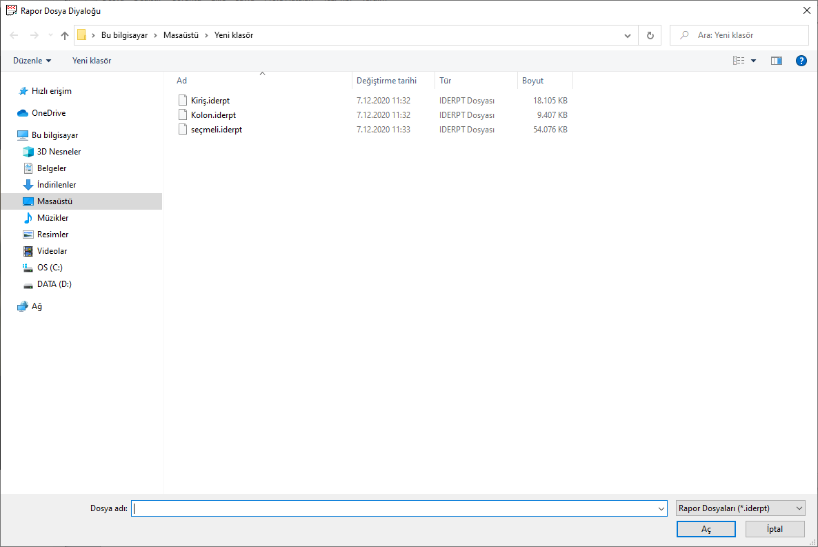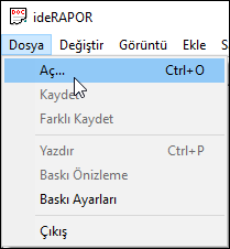 Açılan Rapor Dosyası Aç diyaloğundan açmak istediğiniz rapor dosyasını seçin ve Aç butonunu tıklayın.
