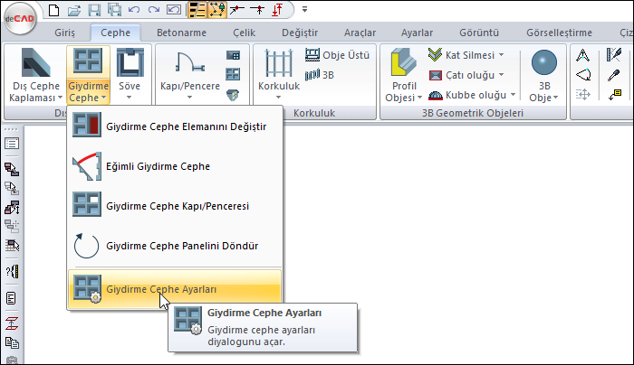 Ribbon menü Cephe sekmesi Dış Cephe başlığı altından ulaşabilirsiniz. Öncelik giydirme cephe ayarları diyaloğunda sınır, dikey ve yatay kayıt sekmelerinde yer almaktadır.