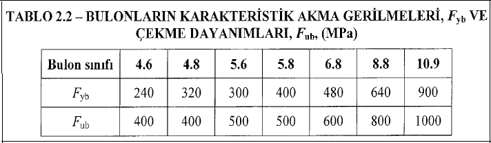 Bulonların karakteristik çekme gerilmesi dayanımı Fnt, Tablo 2.2 de verilen bulon malzemesi karakteristik çekme dayanımı, Fub ye bağlı olarak hesaplanır.